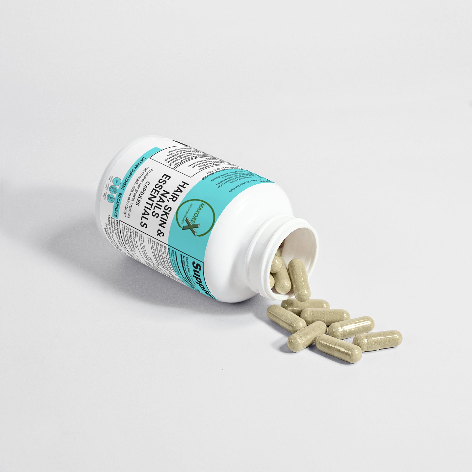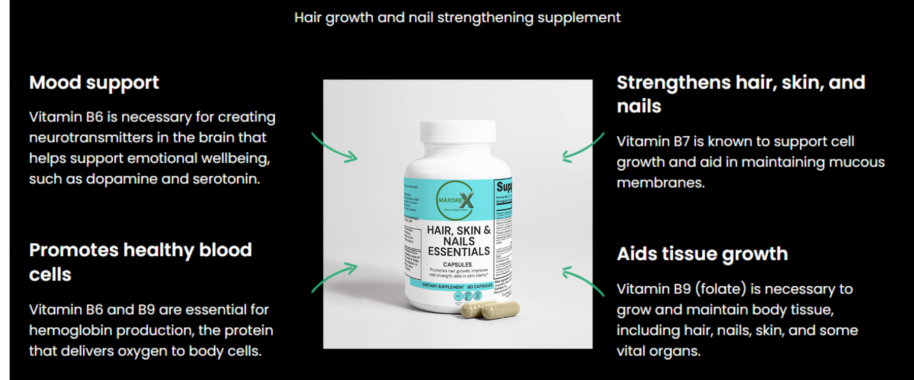 Our Hair, Skin, and Nails Essentials supplement is made to give you that natural glow. In combination, Vitamin B6, Folate, and Biotin work together to maintain elastin in the hair, skin, and nails. Elastin is a major component of body tissues, helping them function correctly.*